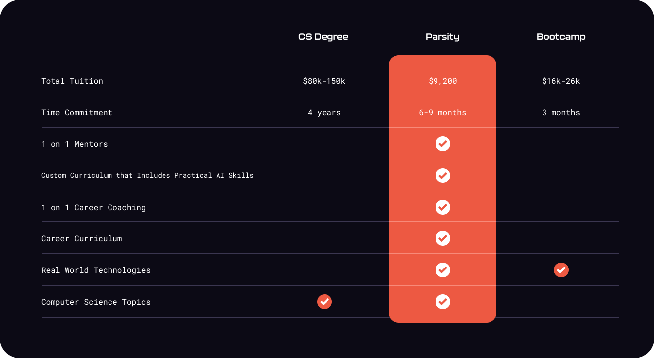 Parsity is a small, accredited coding school teaching a foundational skill for high-paying roles in software development, AIÂ and entrepreneurship.